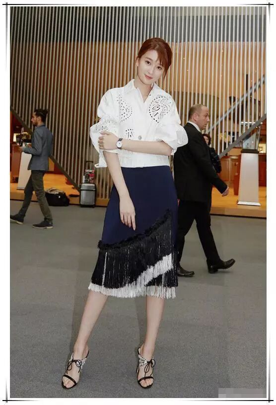 乔欣上身穿着白色镂空的宽松针织衫,特别的小女人,下身黑色带有流苏的裙子,真是很好的设计,这一身看起来端庄秀丽呐。