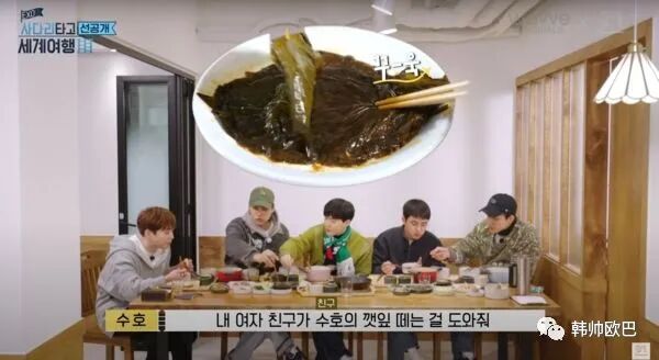 Suho先开启话题,向大哥XIUMIN提问,假如女友与他、XIUMIN3人一起吃饭,是否可以接受女友出手帮忙压芝麻叶,XIUMIN毫不犹豫表示:「帮忙压没关系,但不能帮忙分开。」Kai一头雾水问他「差别在哪」,他回答:「差别在于筷子有没有碰到。」无法接受女友的筷子碰到友人的筷子。