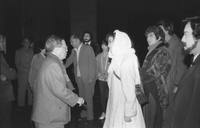 这幅照片,曹禺先生先去法国大使馆被授予了中法文化使者的奖,晚上去看的这个演出。这是中戏导演系某班的《复活》。女主演是徐松子,她曾演过非常著名的“伤痕”话剧《救救她》。她演出这个剧之后报考了中戏导演系,毕业之后拍过电影《芙蓉镇》。还有这位,当时我镜头再稍微往左偏两度,这个人就能拍全了,他是后来的中戏的院长徐晓钟老师。