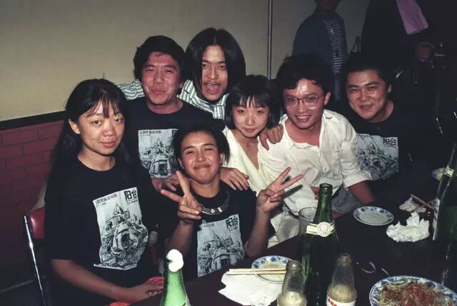 1993-09-18《阳台》首演庆功会(左起:石琳琳、孟京辉、王兰(前)、何勇(后)、廖一梅、沈林、王旭峰)