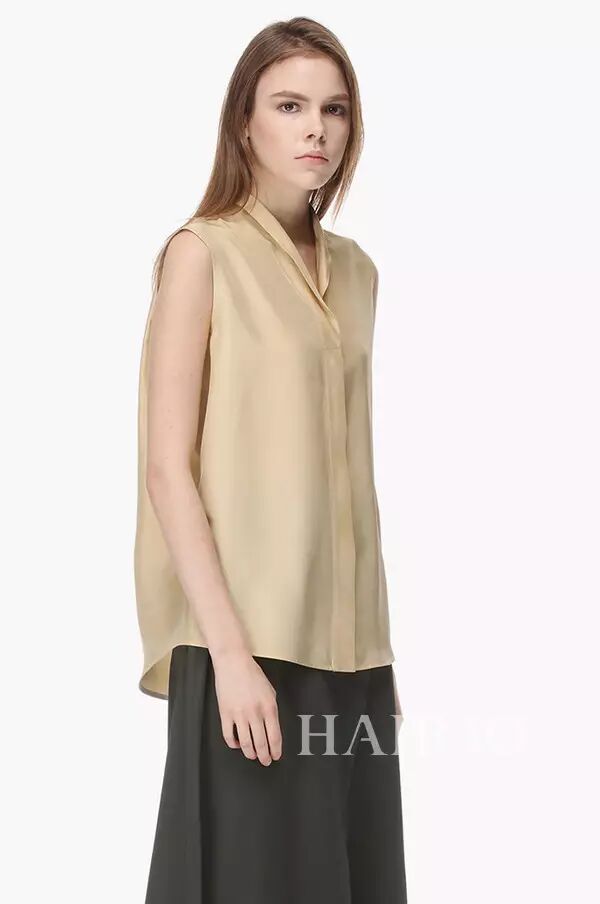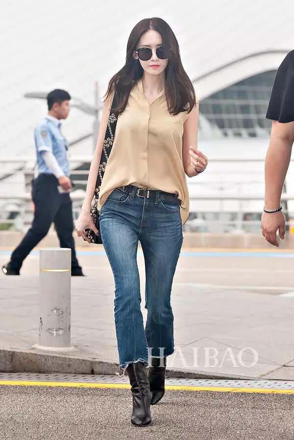 丝质的上衣飘逸又具质感,是这个夏季你一定要拥有的单品之一,上周末允儿出街就穿了一件杏色的,为了中和顺滑“丝绵”浓郁的女性感,她选用牛仔裤、短靴、黑包这些或硬挺或率性的单品来配搭,但牛仔裤以后还是尽量不要选择紧身款啦~
