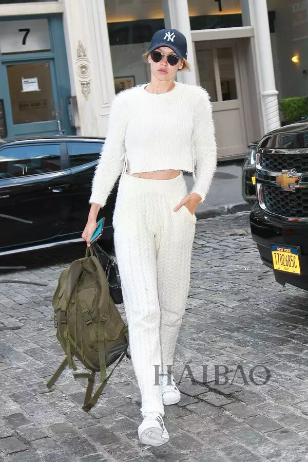 Gigi性子最急,都穿上毛衣毛裤啦!不要看着这身全白的运动风Look温暖舒适又修长,就跃跃欲试,醒醒吧!没有纤瘦身形是无法达到这个效果哒!