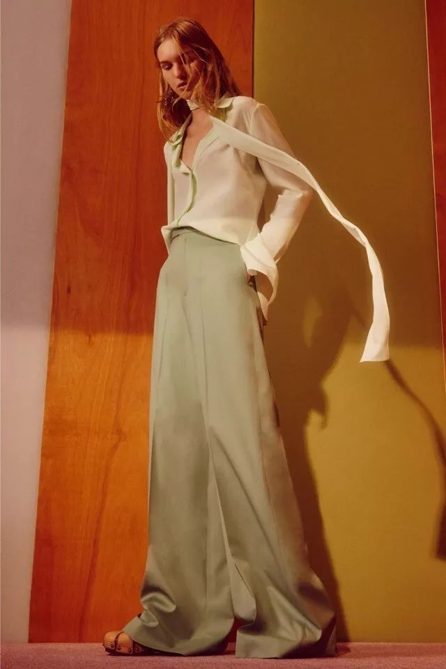 Givenchy现任设计师Clare Waight Keller的2018春夏系列是从Hubert de Givenchy先生的设计草图中获取的灵感,她发现他的设计都是从肩部开始的,所以穿插其中的这件薄荷色跳了出来,搭配橘红色的撞色飘带和裤子,营造出又酷又生动之感。