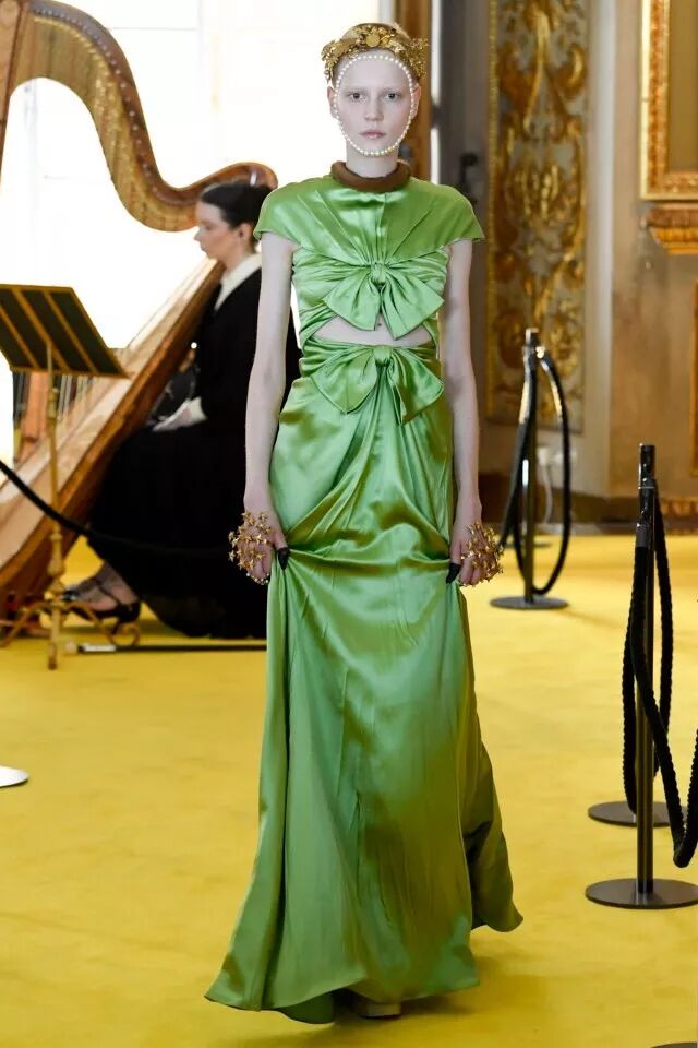 Gucci 2018早春的这条丝绸长裙是本系列中较为实穿的款式了,腰部上下蝴蝶结设计增添了一种春之灵动气息,垂坠的绸缎面料更是展现无尽的高级质感。