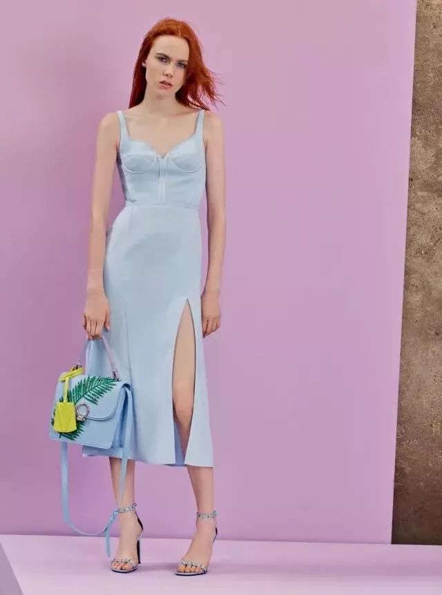来自Versace 2018春夏系列的这条淡蓝色连衣裙,特别之处在于胸部和腰部的独特剪裁,而大腿部的梭鱼型开叉设计,更是把女性的娇柔妩媚展现得淋漓尽致。