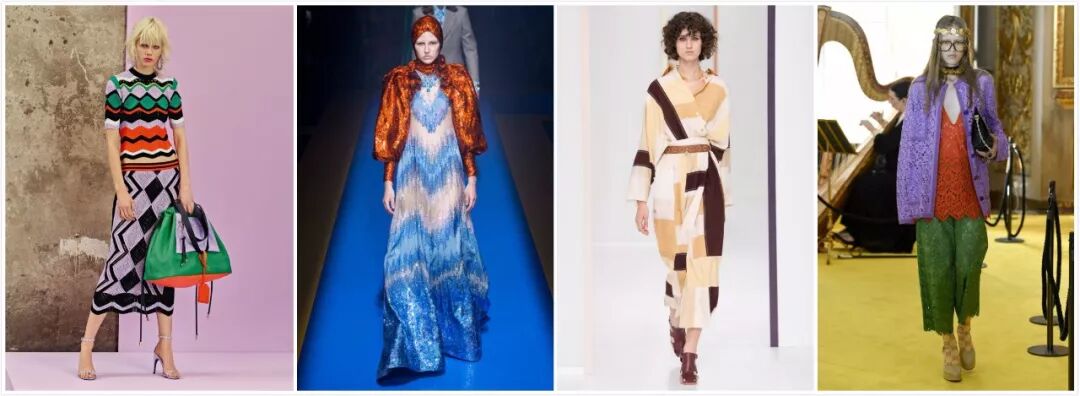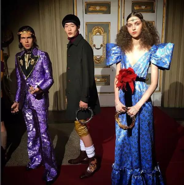 在Gucci本季的2018春夏系列中,设计总监Michele受到Elton John七十年代早期所穿的华丽摇滚风格的舞台服装所影响,所以我们可以看到大量薄纱、金属亮片、缎面百褶等细小的华丽元素出现。