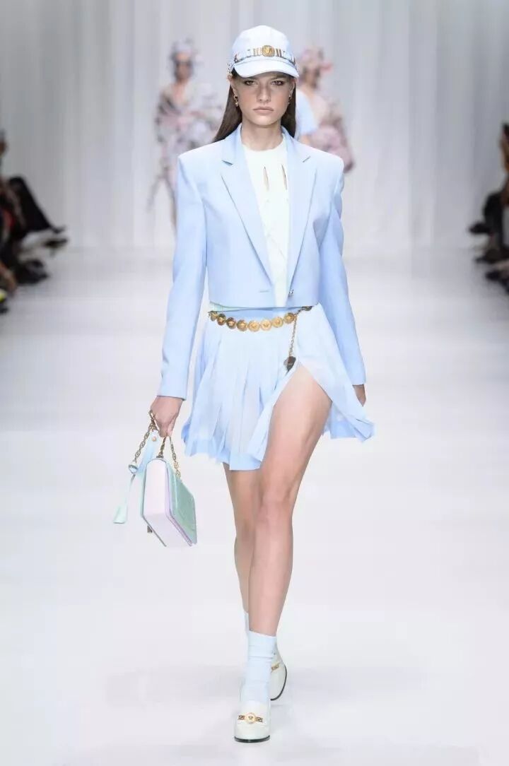 Versace 2018春夏秀场上的这套粉嫩的小蓝色,在看起来严肃的套装中杀出重围,又精神又俏皮,一色系却不沉闷,而且最会“穿金戴银”的Versace还加上一条金链腰带,带出从少女到御姐的双重气质。
