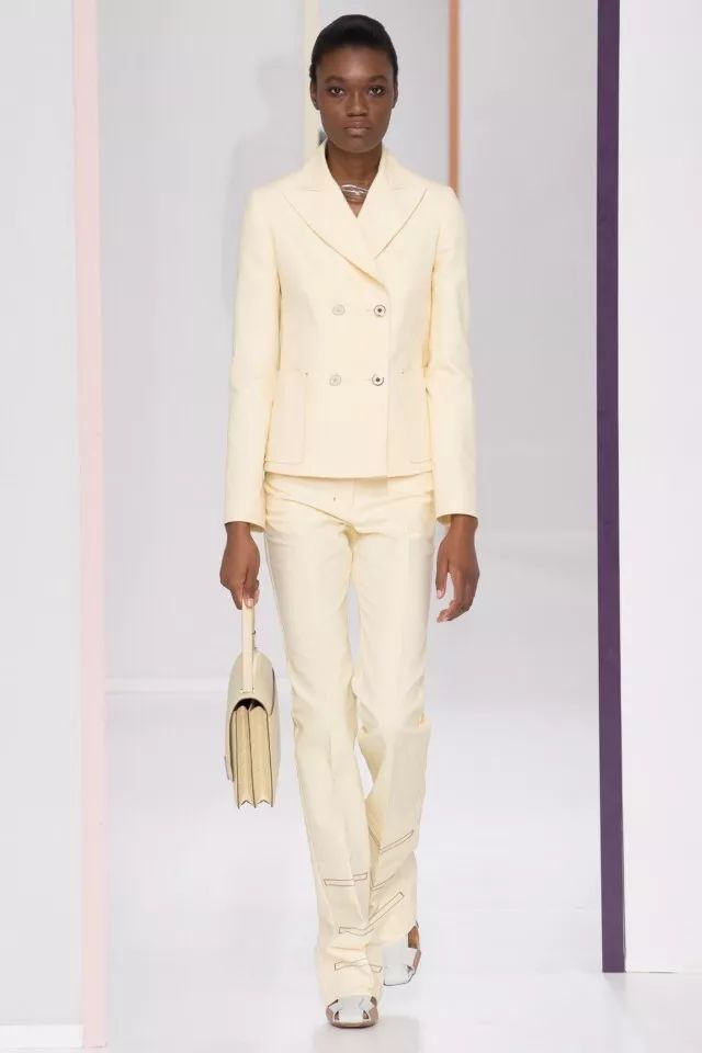 在本季中各大牌推出的同色套装look是最多的!不管是Hermès、Givenchy还是Versace都既有西服衬衫的变形套装,也有复古又经典的长裙套装。