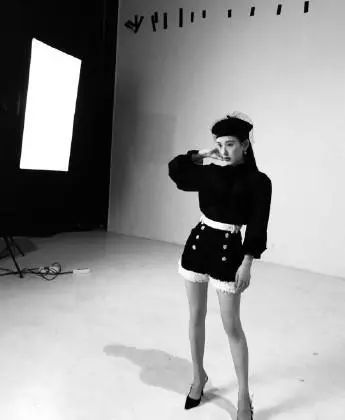 黑白的色调非常的奇怪,高腰的短裤拉长了方媛的整体身高既视感,超短裤的设计更显方媛的大长腿修长纤细,但是摆拍的姿势不太自然,有种做作的感觉,非常的像是网络中的某些红人,脚踩尖头高跟鞋增添了高级感。
