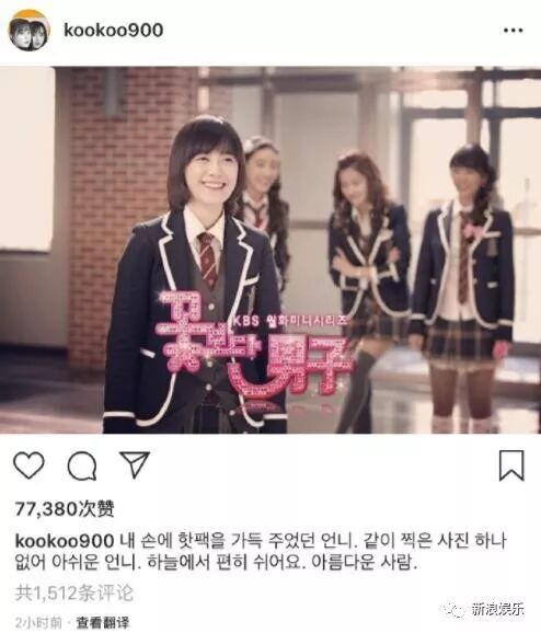 昨天,具惠善在社交网站晒出一张《花样男子》的剧照,并配文:“塞暖宝宝在我手里的姐姐,遗憾一张合照都没有,在天上好好休息吧。”
