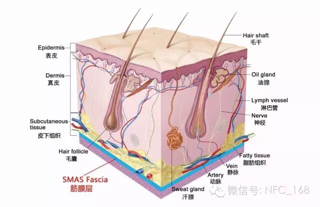 皮肤构造由浅至深,分别是表皮、真皮、皮下组织以及SMAS筋膜层,筋膜层下方是肌肉和骨头,从骨头向上生长的垂直韧带,则是脸部老化的关键之一。年轻的你,肌肤看起来是如此光滑紧实,主要是因为筋膜层(垂直韧带),同心协力地支撑住脸部软组织和脂肪,其中垂直韧带强度更强,能够进一步hold住筋膜层!