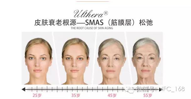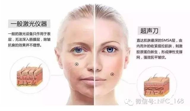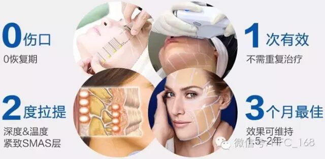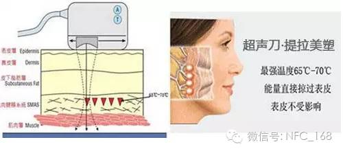 利用HIFU的声波聚焦原理,通过仪器精准控制能量聚焦在皮下组织3mm处的胶原蛋白层和4.5mm的筋膜层(SMAS)上,当温度上升至65℃,聚焦处的SMAS产生蛋白凝固反应,从而以凝固点为中心向四周产生拉力,同时刺激胶原蛋白重组补充,新生成的胶原蛋白可以渐渐从内紧致和提升皮肤,回复弹性,达到消除皱纹效果。