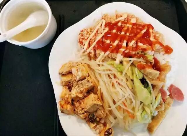 除此之外还可在十多种配菜中任选三种,平价且量大,搭配一碗温热的紫菜蛋汤真真是极好吃哒!!!
