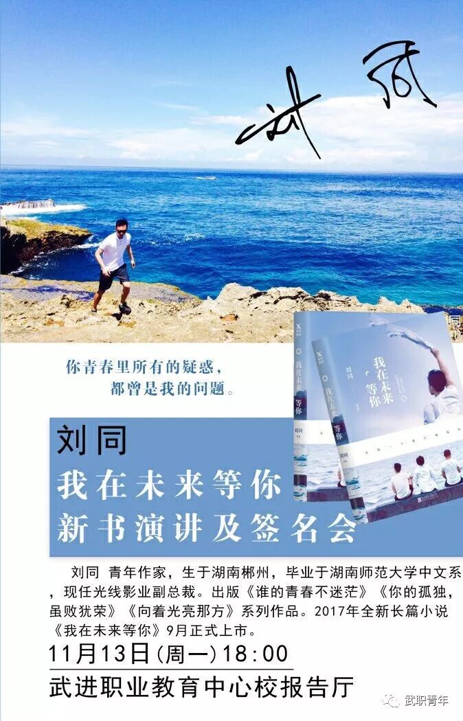 各位亲们,听完刘同小哥哥的讲座是否对书充满了兴趣,周一白天新华书店将在我校树人大道会有刘同新书《我在未来等你》的专卖场,请有意购买的同学提前购买,我们在这等着你!