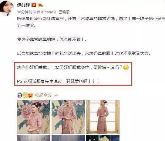 微博最后还是打call秦昊:“劝你们好好爱我一辈子,好好和我交往,好好珍惜,造吗?PS:这段狠话和秦先生说过,颤抖”,日常秀恩爱已经成为伊能静微博中必不可少的内容,这次又装恩爱来了,也引起了网友的调侃,网友:隔夜饭都喷了!
