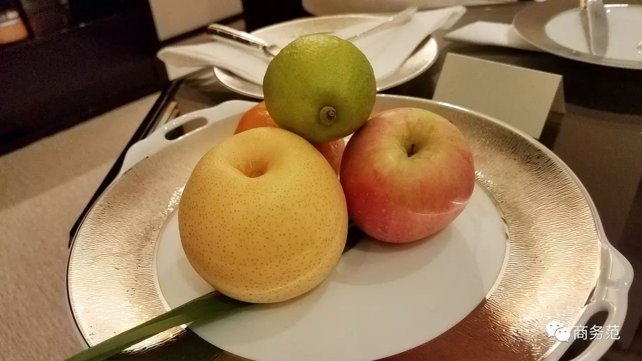 屋里还有新鲜的水果,盘子是法国顶级的瓷器品牌Bernardaud,刀叉则是英国纯手工的银器Gainsborough。