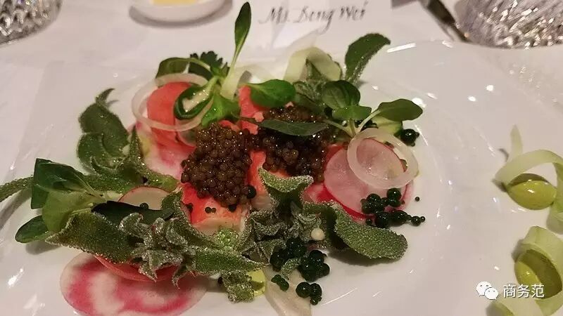前菜是黑鱼籽、帝王蟹脚配柠檬汁及七彩蔬菜沙律↓