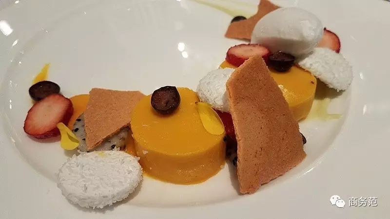 饭后甜点,芒果奶冻配椰子雪葩,还有椰子棉花糖、白酒啫喱和热带水果沙律。我对芒果过敏,一吃就眼睛肿成灯泡,这道菜就无福享受啦。