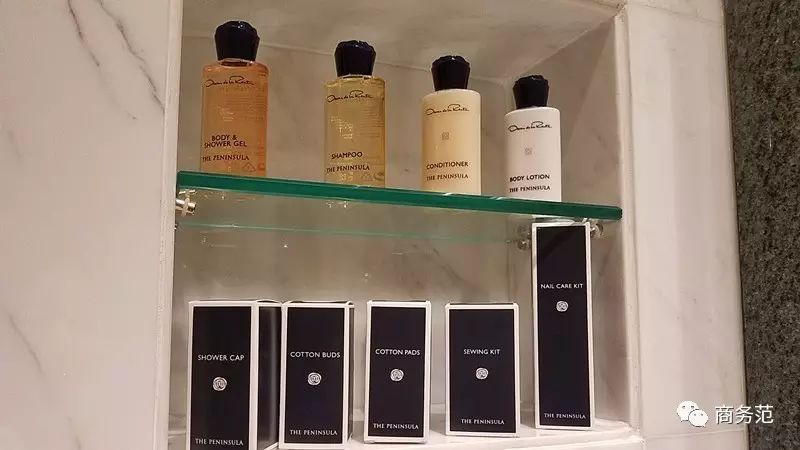 洗浴用品,半岛用的是时装大师Oscar de la Renta生前主持调香的定制备品,弧形瓶身配玫瑰造型瓶盖,香调是茉莉、麝香和柑橘混合香。