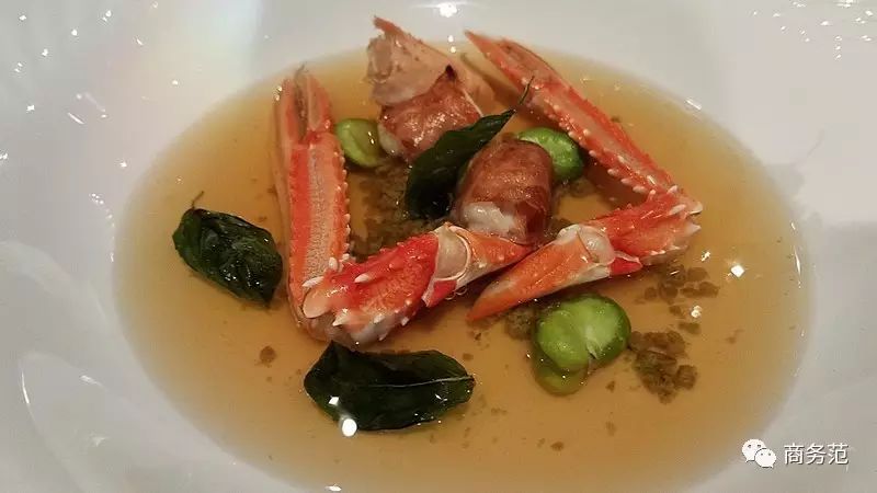 汤品是风干火腿小龙虾卷配海鲜清汤。