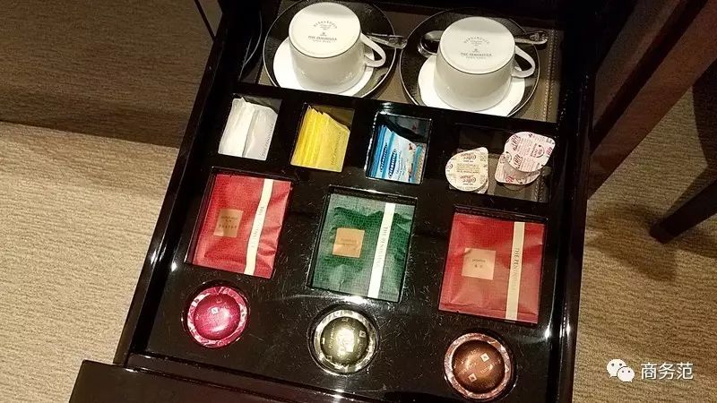 喝的,有茶包和胶囊咖啡,相配的糖包和奶球都有,不喜欢喝咖啡的盆友依旧可以来一杯香浓的普洱茶。配套的茶杯是法国顶级品牌bernardaud的骨瓷杯,这个牌子是很多国家宫廷餐宴的指定餐具品牌,设计简洁低调。