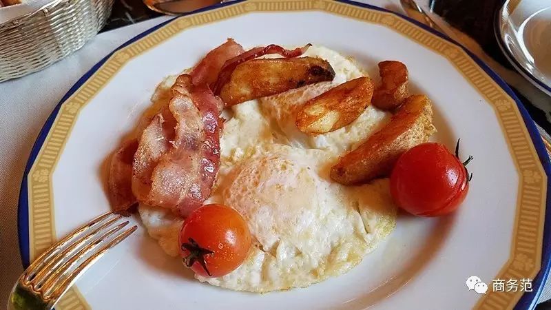新鲜的鸡蛋可以自选烹调方式,范主选择了双面煎的溏心蛋,配了烟肉、薯角和小番茄。