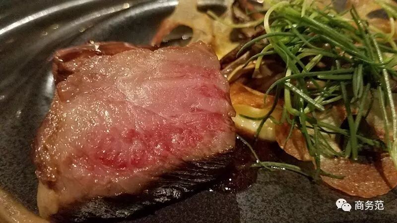 主菜是班兰烧日本A5西冷配红葱头汁,搭配煮蘑菇和薯片,肉片鲜嫩肥美,适合范主这种肉食动物。