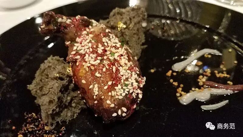 焦糖白鸽胸配鸭肝及胡椒脆片,配上黑藜麦和杏仁蛋糕。虽然这道菜有点晓腻,但是鲜嫩的鸭肝还是让范主久久回味~