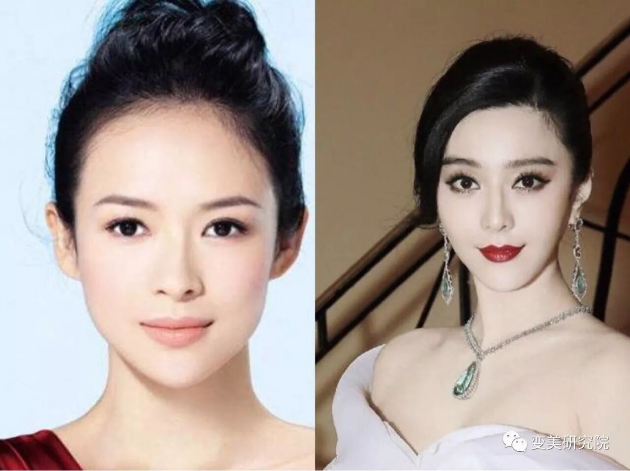 这种组合的美感,我们可以对比下章子怡和范冰冰的下半张脸,章子怡的角度明确的腮骨加上很尖的下巴本身就有种倨傲的艳丽感,而不是范冰冰的妖媚。