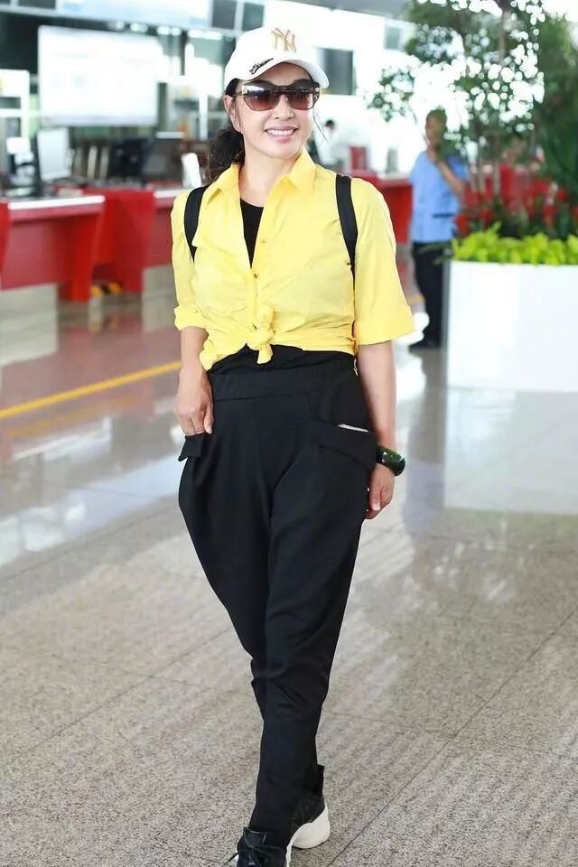 刘晓庆脸上稍微化了一点妆,感觉气色就变得不一样,但是可能因为口红的颜色比较淡,所以气色还是有一点苍白的,上面穿的是一件黄色的衣服,下面搭配的就是一条黑色的裤子,不过感觉这条裤子实在是太宽松了一些,所以就穿不整齐呀!