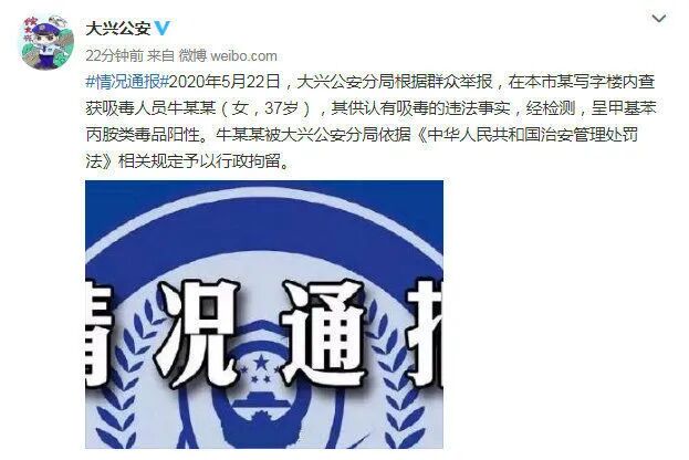 紧接着,不知道是不是被牛萌萌毫不知耻的劲头给惹恼了,大兴公安发微博通报——5月22日牛某某在写字楼内被查获XD。