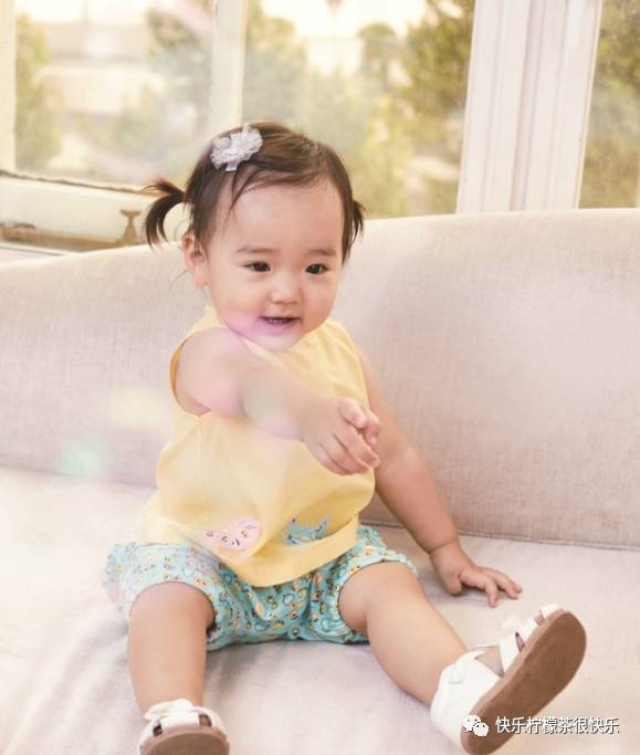 头戴小花,梳着两个上翘的小辫,身穿黄色上衣,蓝色小碎花的裤子,漂亮可爱的小酒窝,眼睛炯炯有神,果然,像网友所说的:越来越像爸爸和妈妈。