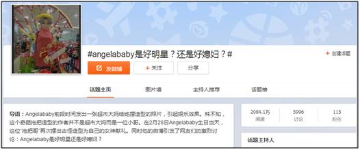 据了解,#angelababy是好明星?还是好媳妇?#话题就是新浪微博由“拖把哥”的微博抓取形成,话题曾登上微博热门话题榜前5名,阅读上千万。