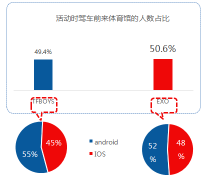 EXO粉丝驾车来观看演唱会的人数稍多,对周边道路拥堵影响更大。同时EXO的iPhone用户占比更多,说明更有钱。