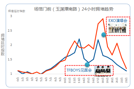 TFboys场馆内热度略高于EXO,说明入场粉丝数略高于EXO。TFboys造成的拥堵比EXO提前半小时,也说明TFboys的粉丝可能更积极热情。