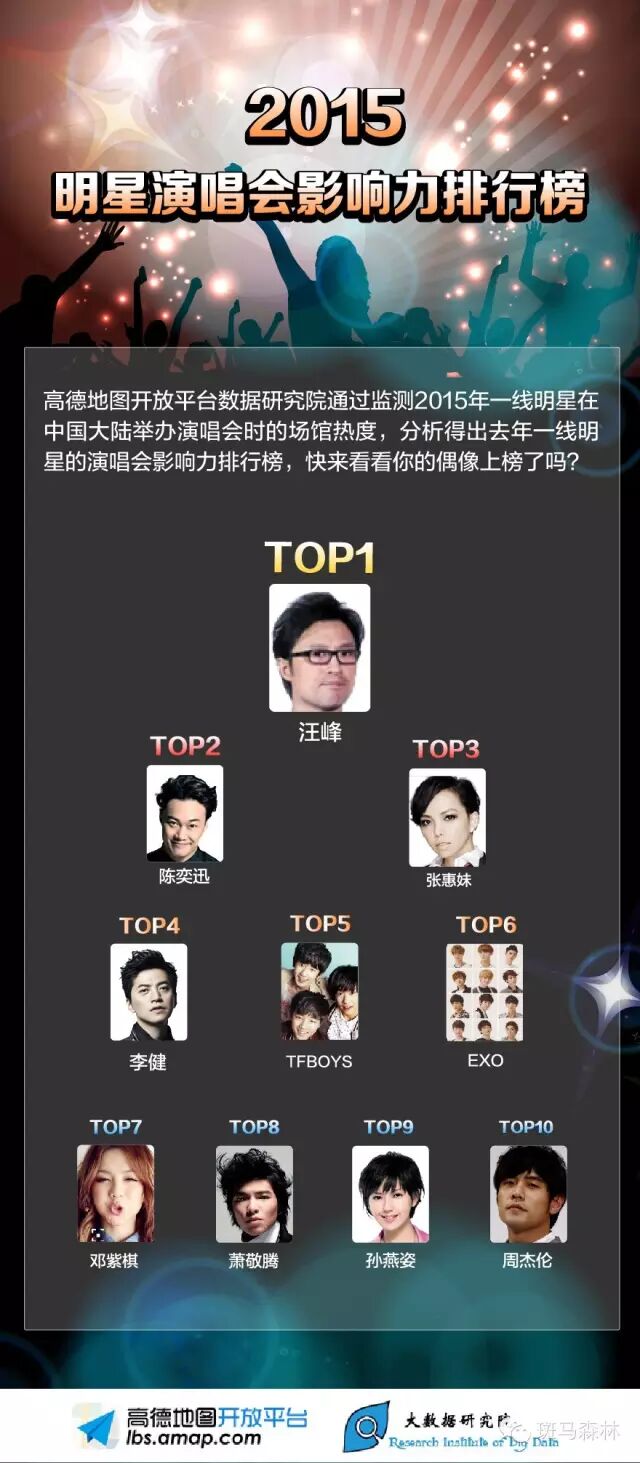 高德地图开放平台大数据显示,2015年一线明星举办演唱会时的场馆热度汪峰最高,超越众歌神和小鲜肉,成为年度演唱会最有影响力的明星。
