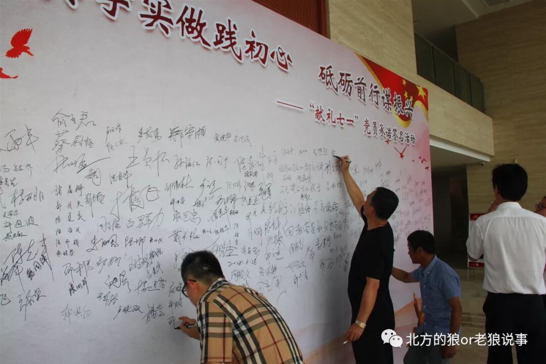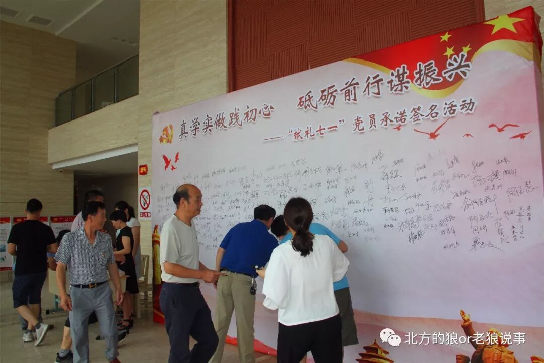 笔者用镜头记录了低塘街道各村(社区)、企事业单位的党员代表在步入会场时,签到并在“献七一”党员承诺签名墙上签名留念。每位党员们戴好党徵,有序地步入会场就座。