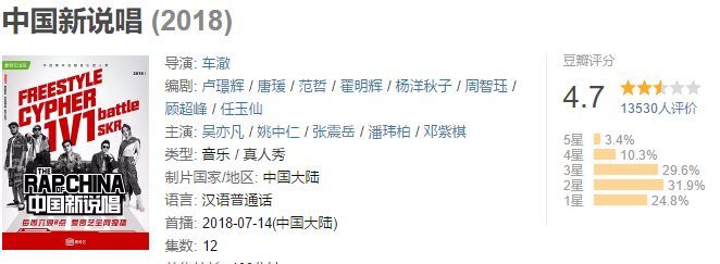 而这两档冠以“中国”之名的音乐综艺,却没能在今年夏天掀起全民热度。截至目前,《中国新说唱》豆瓣评分4.7,《中国好声音》6.3的评分也刚过及格线,而此前第四季的评分为5.9,第三季仅有5.7。