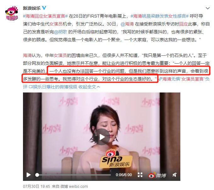 这几天,被海清在FIRST青年导演展上发表的一系列呼吁导演给“中生代女演员机会”的言论刷屏了。