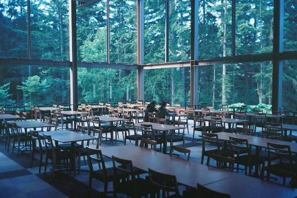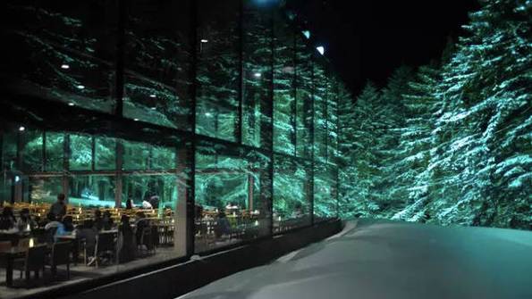 墙体被巨型的落地窗取代。无论坐在哪个角落,都可以一眼看尽窗外生长了150年的雪松林。