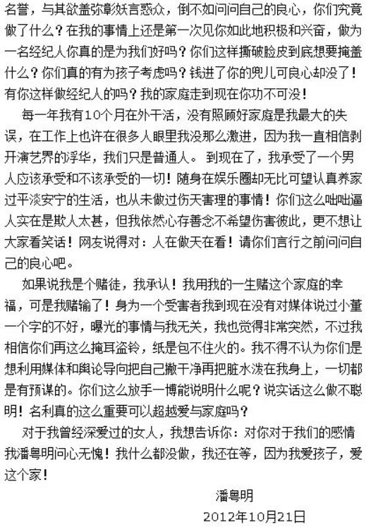 48岁潘粤明和董洁高调复合?网友怒了:我们竟然被他骗了11年! LadyDaily 内地男星 2023-02-08 22:00:39 251 创作不易,用心坚持,欢迎请BaGua喝几杯爱心咖啡!打赏并支持本文 打赏并删除本文 来源丨捡书姑娘ID丨jianshu126前两天凌晨,潘粤明儿子生日,潘粤明照例为其微博庆生。本来很普通的事,可是他闪亮亮地@了前妻。不但@了,潘粤明发完微博没几分钟,董小姐转发。完了“顺手”回关男方。曾经以为老死不相往来的一对,如今却在公众面前大方携手、展现和谐一幕。震惊、吊诡、超出认知,甚至感觉被骗......曾经为他打抱不平那么多年,竟都错付了?联想到潘粤明去年发过一条莫名其妙的微博,配文:“想你和作死有区别吗”。以及董小姐前不久发的新年祝福,配图里两人依偎看烟花的背影格外温馨。众人不得不做出合理推测:这真的要复合?但,怎么看都还是不可思议。毕竟当年,两个人分的是真难看啊。01小潘和小董,当年是羡煞旁人的金童玉女。潘粤明现在叫潘叔了,但他年轻时候绰号是“奶潘”,顾名思义,又奶又纯。之前有年纪小的网友发帖问,“请问这个男主是退圈了吗?”配图正是奶潘的代表作《白蛇传》。他饰演的许仙,是许多版本里唯一一位对白娘子死心塌地、生死不移的痴情儿。当时32岁、没经历过多少风浪的潘粤明,脸上没半分沧桑,双眸里尽是天真,演起纯情人设来毫不费力,相当让人信服。在许仙之前,他的房遗爱和曾荪亚,一个存在感不高却让人同情,一个个性讨厌,但帅气耿直,让人恨不起来。书香世家出身的潘粤明,配着一幅好皮囊,天生自带世家公子的贵气和松弛感,在这之上,自然孕育出天真懵懂,是不染尘埃的模样。与“金童”二字大为贴合。董小姐与“玉女”则愈发贴合了。那样的一张脸,是如今内娱流行的“小白花”长相的极致模板。巅峰之作冷清秋,人如其名,清冷倔强疏离,她自画中走出,这样的仙女也只能从画中走出。国产剧后来再也没有这一款人物,能如此令人魂牵梦绕、令人爱彻心扉。多少人因为这个角色一直对她有滤镜包括《天若有情》的展颜、《新梁祝》里的祝英台……没有人不在她的美貌中沦陷。包括养尊处优的贵公子潘粤明。金风玉露一相逢,便胜却人间无数。两人拍戏结缘,低调恋爱几年,随后低调结婚,不久便有了儿子顶顶。金童与玉女的进展相当顺利,一切都是最幸福的模样。那时候明星都把微博当朋友圈发,所以到处是潘粤明秀恩爱的痕迹。他宠溺地将对方叫作小D,晒出他们的恩爱缱绻与琴瑟和鸣。他幸福得太完美,一丝一毫都没想过爱的港湾将会遭遇风暴。所以当风暴来临,他被标记粗暴无礼、嗜赌成性时、被造谣因车祸身体残疾时,他不愿相信、不想接受。他发了篇长文,斥责女方经纪人挑拨离间、反思自己长期在外没有照顾好家庭,但通篇没有一个字责怪女方。甚至表示“她是我的骄傲”。末了还补一句“我还在等”,幻想着破镜重圆。痴儿形象与许仙完美重合。后来真相反转双方反目,潘粤明从千夫所指登上道德高地,但就这样,他也没对女方口出恶言,有关对方的微博,至今也一条没舍得删,而且一直没取关对方。如今,竟然还来了个世纪大和解,一起为儿子庆生。所以也难怪,网友纷纷送他晋升“内娱头号恋爱脑”,渲染他旧爱难忘,甚至期盼一个世纪大复合。但依姑娘看,真的,大可不必,网友们总容易想太多。02就算潘粤明曾经是“恋爱脑”,但经历风雨的人不可能没有成长。他只是很正常的、爱自己的儿子。离婚第二年的时候儿子生日,他在博文里动情地说,“如果能换你一生的幸福,我宁愿痛苦一辈子……”称得上字字泣血。之后每年儿子过生日,他总掐着点送祝福。而不删恩爱博的原因,他曾经也亲口解释过,“至少让孩子知道,他是因为爱才来到这个世上的”。有传闻说潘粤明自从离婚后就很少见到儿子,不管真假,但平时把微博当朋友圈发的潘粤明,的确很少跟儿子互动。但今年庆生博,从两个表情符号进化到真人视频,不止屏幕里的顶顶开心,想必屏幕外的老父亲,也一定一脸欣慰吧。他终于得偿所愿。至于@前妻,以及前妻从恨之入骨到转发回关的转变,我情愿认为两个人都是真心想和解了,不为其他,单为血脉相连的孩子。成长中无论父母哪方缺位,对孩子的影响都是终生,潘粤明应该很不希望,孩子长大后需要用一生去治愈童年。董小姐也是,不管错对几何,这些年的确是她在悉心照料儿子,顶顶长得帅气是遗传父母的天赋,但顶顶也拥有善解人意、懂事温柔这些珍贵的后天品质。她把儿子教育得很好。双方也许做不到毫无芥蒂,只是事隔经年,恩恩怨怨,都随着低谷的过去而无须计较了。潘粤明因《白夜追凶》翻身,如今又手握《鬼吹灯》大IP,人在高点之后,反而愿意回忆曾经的不堪、甚至释怀当年的苦难。董小姐事业也有起色,当年《如懿传》皇后一角很是惊艳。明星也是人,是人就有七情六欲,有爱恨嗔痴,会犯错,也会想要弥补些什么。所以现在的场面,意料之外,情理之中。事物总要向前发展的,关键看什么节点,但不大可能僵持一辈子。其他家明星分手未必这么难看,但对孩子的爱,那也是一点不比他俩少的。03李湘王岳伦离婚当时也闹得比较大,感情基本破裂完了,之后女儿王诗龄跟妈妈一起生活。但离归离,没耽误王岳伦爱女儿。微博上时不时秀下爱女;女儿画作得奖,第一时间得意洋洋晒出来;王诗龄去英