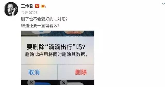 王传君在微博发布一张截图内容为:卸载滴滴App。