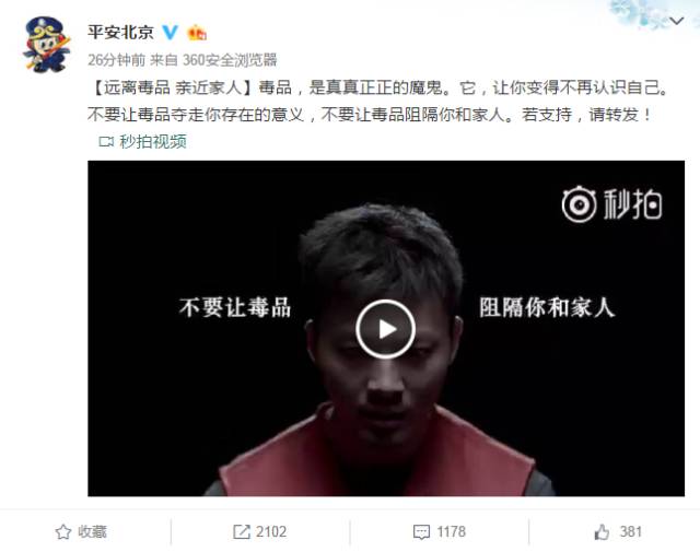 今天上午10:45,@平安北京 发布了一条远离毒品内容的微信!引起了网友们的纷纷猜测!