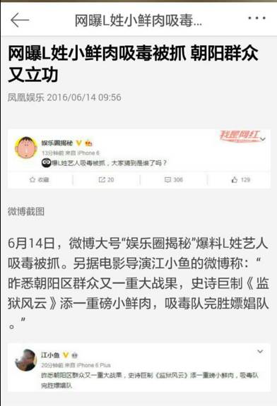 6月14日,微博大号“娱乐圈揭秘”爆料L姓艺人吸毒被抓。另据电影导演江小鱼的微博称:“昨悉朝阳区群众又一重大战果,史诗巨制《监狱风云》添一重磅小鲜肉,吸毒队完胜嫖娼队。”