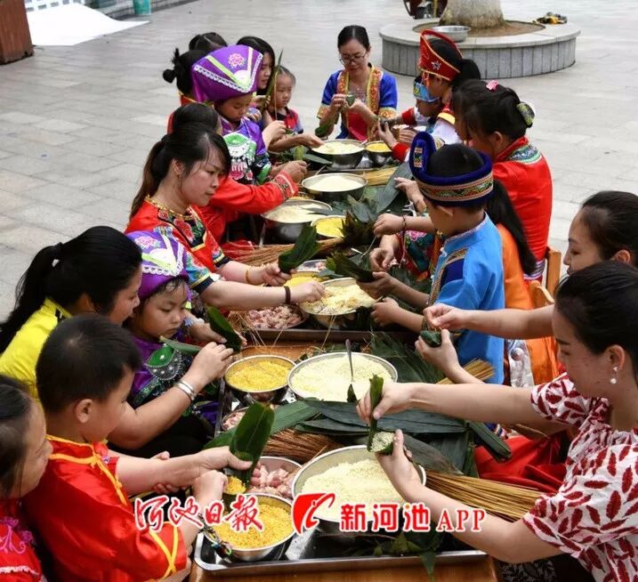 ▲ 图为金城江区启航幼儿园的老师、家长和小朋友一起包粽子。河池日报记者高东风 摄