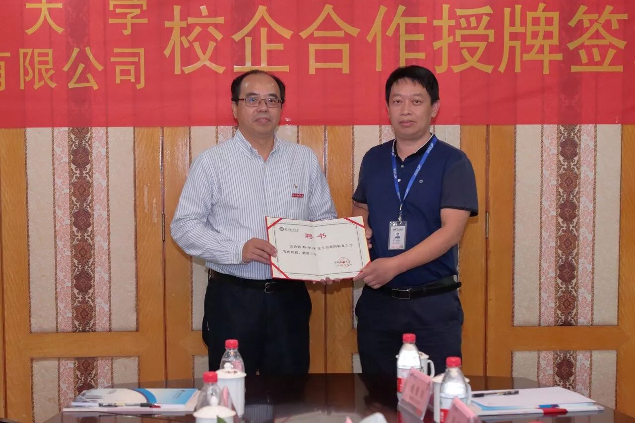 双方在进行深入的洽谈后,黄校长代表黎明职业大学与茂荣集团股份有限公司签订了校企战略合作协议,并授牌匾,聘茂荣集团股份有限公司工程副总经理杨奇祥为黎明职业大学客座教授,双方代表合影留念。