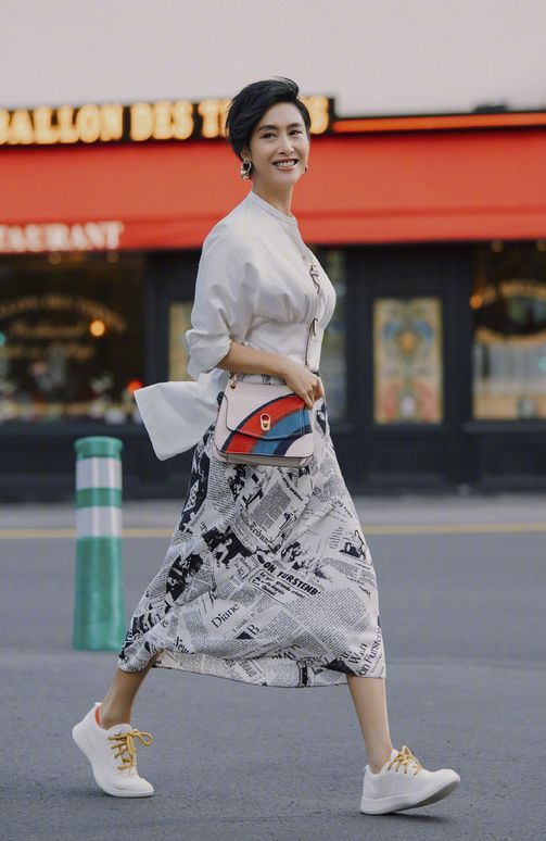 印花作为服装的一种设计元素会给服装增添很多的意趣,它的适用性较广,适合每个年龄段,让人显得更为活泼轻快。朱茵的这条连衣裙的下半部分是图文印花,给人复古怀旧的感觉,上半身为纯白款式,很好地将简单和烦冗进行融合,遵守了搭配规则,穿起来既有复古又有摩登时尚的感觉。