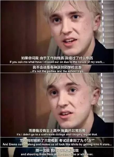 当年在《哈利波特》片场艾玛被昵称为“One-Take Watson”,意指她的戏份基本一次就过,甚至自己的台词不仅牢牢记住,还把哈利和罗恩的台词一并记下来,小伙伴想不起台词时,还会悄悄地口型告知。这还不算,趁着拍摄空挡,甚至每天花费5小时的时间来学习功课,扮演马尔福的汤姆费尔顿就曾感慨过与艾玛之间的差异。