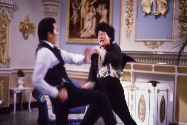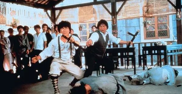 成龙的做法是,进一步加快动作的速率和节奏,把一对一单打模式变成一对多或者多对多,不断提高动作场面调度的复杂程度,来达到牢牢吸引观众注意力的目的。