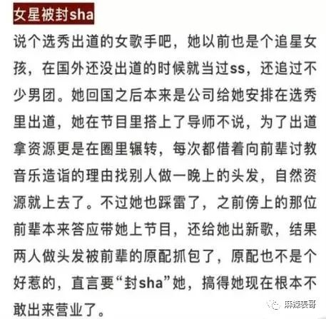 这个爆料的来源得追溯到2017年,当时说有个做私生的选手歌手,勾搭导师了要资源,后来被这个前辈的原配抓包,于是封杀。